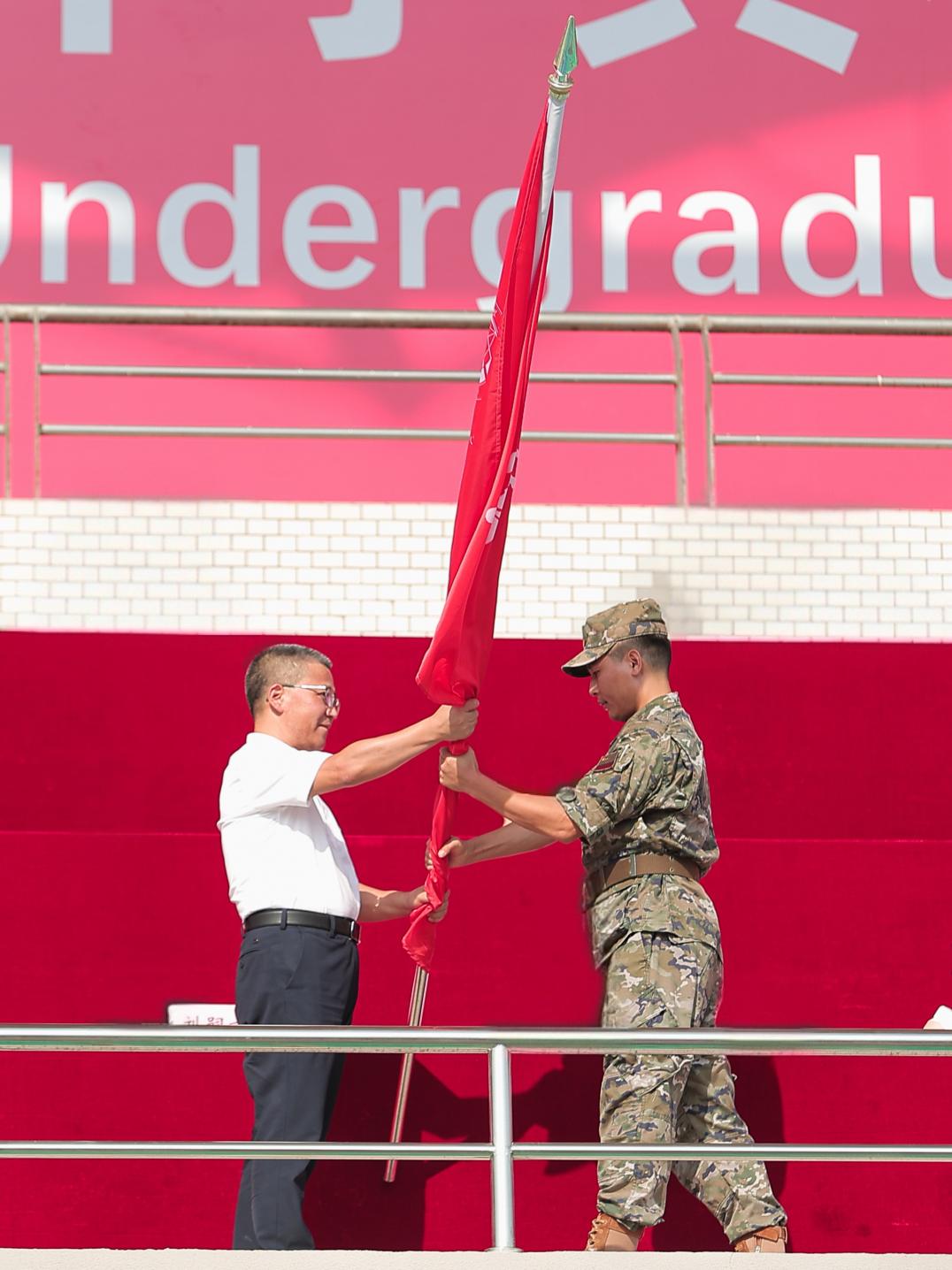 黨委書記劉嗣方向軍訓(xùn)團(tuán)授“四川外國(guó)語(yǔ)大學(xué)學(xué)生軍訓(xùn)團(tuán)”團(tuán)旗,標(biāo)志著學(xué)校2025級(jí)新生軍訓(xùn)正式拉開帷幕。典禮在昂揚(yáng)奮進(jìn)的校歌聲中結(jié)束。