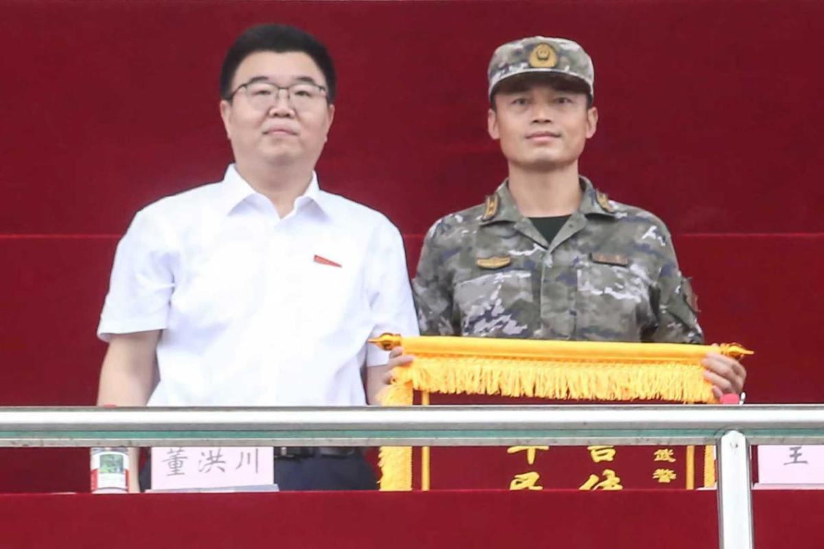 校長董洪川代表學校向承訓部隊贈送錦旗,感謝承訓教官們以軍人風采以身作則,嚴格施訓、科學施訓、因材施訓。