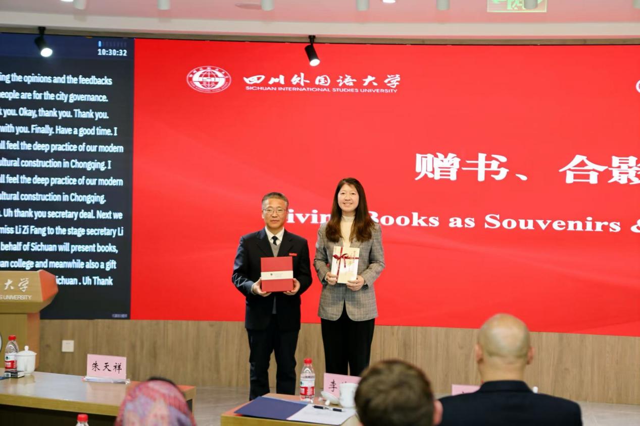 認(rèn)真聆聽主旨報(bào)告后,蘇世民書院的學(xué)生們反響熱烈,踴躍提問。劉嗣方針對(duì)學(xué)生們問題逐一回答,重點(diǎn)圍繞智慧城市建設(shè)愿景、城市治理中的全過程人民民主等問題,通過列舉現(xiàn)實(shí)生活中的生動(dòng)案例和精彩故事,結(jié)合理論和實(shí)踐,向同學(xué)們深入淺出地揭示了重慶在超大城市現(xiàn)代化治理中的中國(guó)特色和治理密碼,得到大家發(fā)自內(nèi)心的認(rèn)同,贏得陣陣掌聲。劉嗣方還代表學(xué)校向清華大學(xué)蘇世民書院贈(zèng)送了《奮力譜寫中國(guó)式現(xiàn)代化重慶篇章》一書。蘇世民書院也向川外贈(zèng)送了紀(jì)念品。