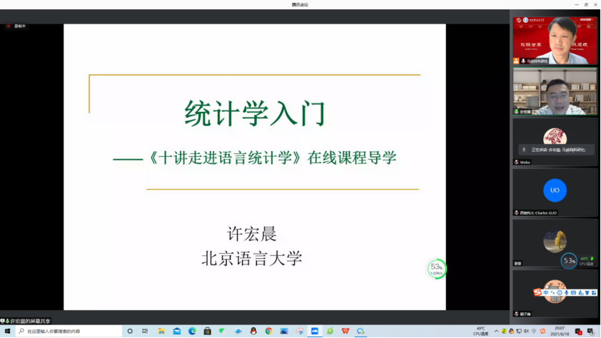 科學研究,統(tǒng)計先行。針對我校部分青年教師統(tǒng)計學基礎薄弱問題,科研處和教師發(fā)展中心特邀北京語言大學許宏晨教授于2021年6月18日進行《統(tǒng)計學入門》線上講座。該講座也是我校購買的“教師發(fā)展智慧研修空間”眾多在線課程之一《十講走進語言統(tǒng)計學》的導學課。講座由科研處馬武林教授主持,吸引了學校青年教師、博士研究生和碩士研究生以及來自北外、上外、山東大學、西南科大等高校聽眾150余人。