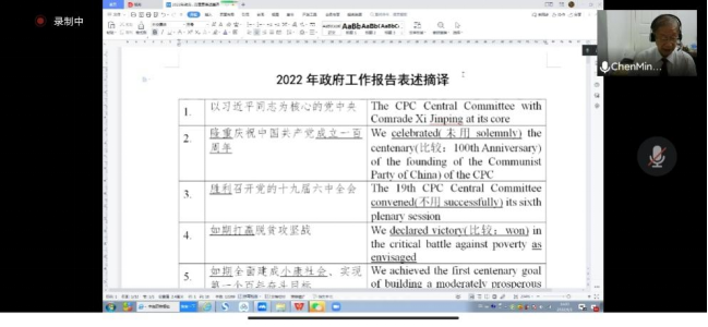 本次講學以最新的2022年政府工作報告的原文和譯文為分析材料。陳明明大使參與了本次政府工作英語譯文的定稿,因此他以自己的親身經歷,為大家講授如何忠實準確翻譯中國特色執政理念。大使提及政府工作報告英譯的重要性,即為世界展示中國的執政理念以及執政理念的透明化。大使以“串糖葫蘆”的邏輯結構,為大家講述了四個重點。第一是“核心政治理念”的翻譯,如“新發展理念”應準確譯為New Development Philosophy,而不能用thought或其他詞語代替philosophy一詞。第二個糖葫蘆則是“概述詞”的翻譯,如“六穩六保”、“四個意識”等。這些概述詞在譯為英文時,一定要闡述其詳細的內涵,以免造成理解困難或歧義。第三個糖葫蘆則是“時政報告的語氣表達”的翻譯處理。例如:“中國人民有戰勝任何艱難險阻的勇氣、智慧和力量”。在翻譯“中國人民”時,考慮到總理作為報告人的立場,應處理為“Wethe Chinese people”,顯得總理和人民之間十分親近,消除了距離感。第四是“高頻詞”的翻譯,如“同胞”、“布局”等。這些詞匯在不同的語境下有不同的處理方法。大使總結認為,時政翻譯需要與時俱進,不斷革新改進。