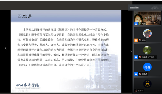 講座之后,大家就相關問題進行了積極的討論和交流。李金樹教授認為兩所大學博士生代表此次的發言代表了兩種不同的研究傳統與路徑,兩校未來還可以加強進一步的合作與交流,以實現優勢互補。胡顯耀教授對劉黎的研究進行點評,認為論文框架清楚,文本細讀的方式開展翻譯史研究值得推薦,并對該話題的進一步深入探討提出建議。廖七一教授對劉艷春的研究進行了點評,肯定語料庫翻譯研究的價值,認為語料庫方法可以解釋傳統翻譯研究方法無法解釋的現象,但也指出研究翻譯共性的同時,需要對翻譯的復雜性進行深入探討。此次線上論壇為西南大學和四川外國語大學兩校的師生交流搭建一個良好的互動平臺,溝通了不同的翻譯學研究方法與路徑,對推動兩校的翻譯學科建設和翻譯人才培養具有積極的意義。