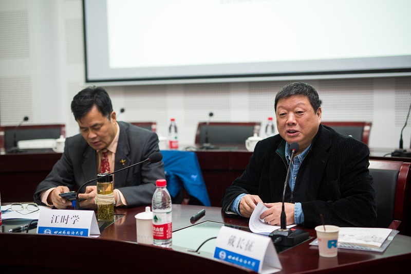 上午9點,論壇開幕式在四川外國語大學西區A2-1會議室準時召開,由國際關系學院宋國華副院長主持,重慶市國際關系學術共同體代表重慶師范大學祝玉峰、四川外國語大學副校長祝朝偉,四川外國語大學國際關系學院院長劉玉梅分別致辭。開幕式后,對外經濟貿易大學國際關系學院院長、博士生導師戴長征作了《當前國際形勢關系演變與中國對策》,四川外國語大學特聘教授江時學作了《對“一帶一路”倡議的認識》的主旨演講。