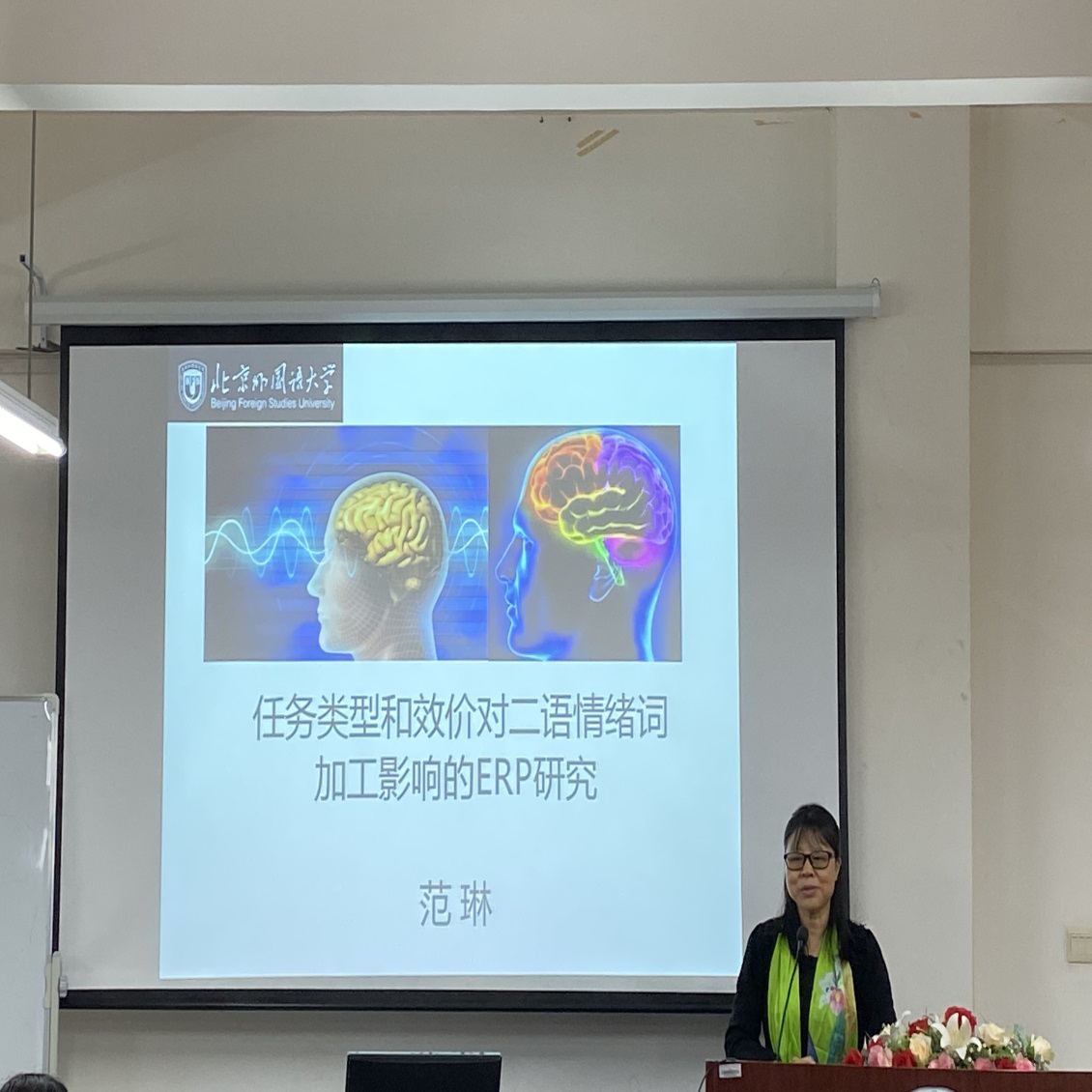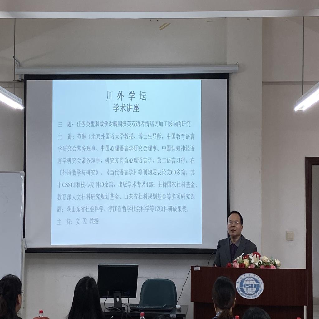 10月15日,應語言腦科學研究中心及川外學壇的邀請,北京外國語大學博士生導師范琳教授在博文樓六樓報告廳舉行題為“任務類型和效價對晚期漢英雙語者情緒詞加工影響的研究”的學術講座。本次活動由語言腦科學研究中心主任、博士生導師姜孟教授主持,我校眾多教師以及碩博士研究生參加了活動。