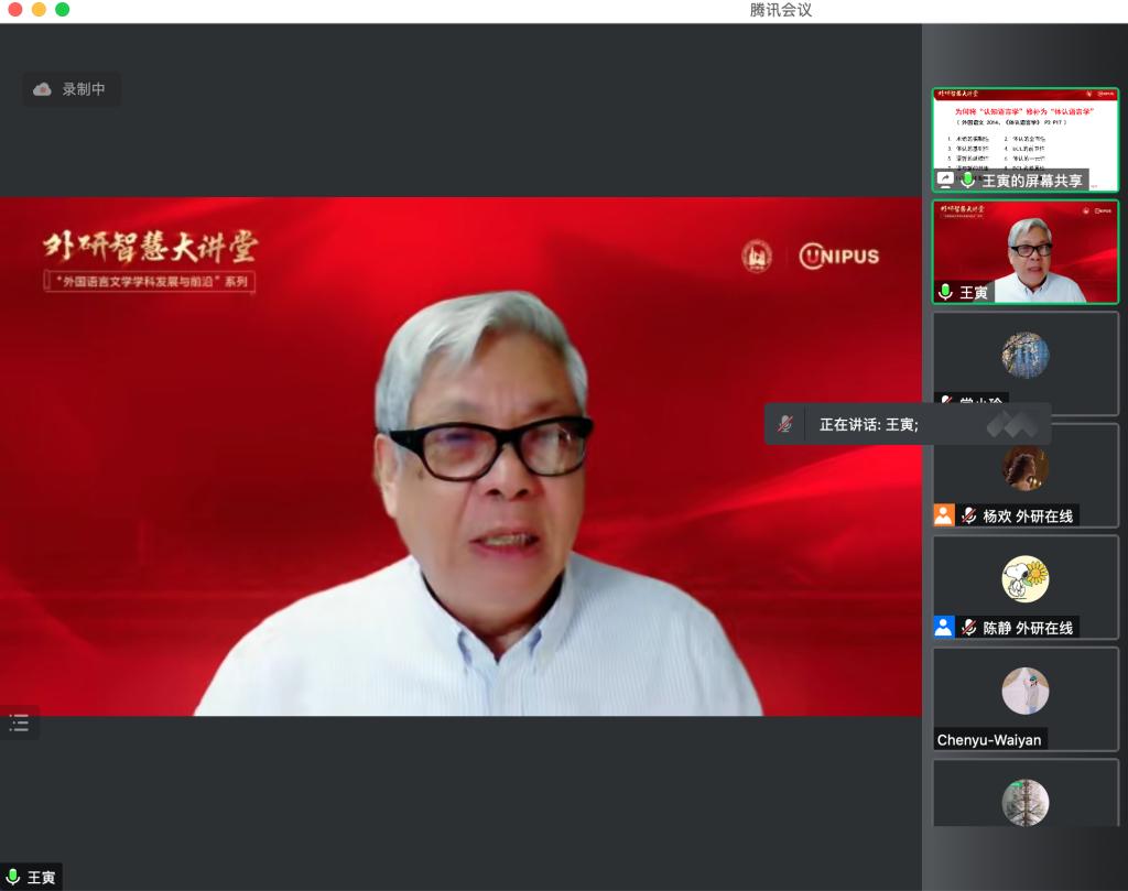 “外國(guó)語言學(xué)與應(yīng)用語言學(xué)”專題第一期于4月9-10日在線開講,主講專家包括斯蒂芬.克拉申(StephenKrashen)、李德.艾利斯(Rod Ellis)、胡壯麟、王寅、姜望琪、辛斌、黃國(guó)文和王初明等國(guó)內(nèi)外著名學(xué)者。四川外國(guó)語大學(xué)資深教授、語言哲學(xué)研究中心主任王寅先生應(yīng)邀作了題為“新文科建設(shè)與體認(rèn)語言學(xué)”的主題報(bào)告,為跨學(xué)科學(xué)術(shù)研究和新文科建設(shè)提供了一種思路,受到大家一致好評(píng),反響熱烈。