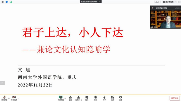 11月22日19點,西南大學外國語學院院長、博士生導師文旭教授應邀為我校師生在線開設了一場題為“君子上達,小人下達——兼論文化認知隱喻學”的學術報告。本次講座是我校外國語文研究中心成立20周年系列講座之三,由我校外國語文研究中心吳淑瓊教授主持,300位校內外專家學者和碩博士研究生通過騰訊會議參與了講座。