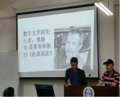 在聽眾的熱烈掌聲中,陳永國教授開始為大家講授令人耳目一新的數字文學研究,陳永國教授認為,數字文學這一名稱比數字人文更能體現弗朗哥·莫萊蒂的文學觀。陳教授引出了弗朗哥·莫萊蒂較早提出并實踐的“距離閱讀”,指出了學術界對這一名詞的誤譯并指出“距離閱讀”在數字文學研究中的重要含義。在《世界文學猜想》中,莫萊蒂認為世界文學研究也許可以為文學領域提供一種分析與綜合的關系,而不僅僅依靠文本細讀,這樣文學史不僅是一種新的寫法,更是一種更為雄心勃勃的設計。“距離”是獲取知識的一個條件,是閱讀與文本之間的距離。莫萊蒂在研究世界文學時發現文學研究者大多集中于西歐文學,即使是西歐文學,也僅僅是研究所發表之文學的1%的經典,也就是說,還有99%的文學未被閱讀,如果文本細讀僅僅依賴這樣的經典,則無法完成文學史的建構。莫萊蒂在“文學屠宰場”中接著回答,在世界文學體系中,各國文學間的關系是不平衡的,小說中外來形式與本土素材融合的過程中反映了一種權力關系,黑格爾說“世界的歷史是世界的屠宰場”,那么,文學的歷史就是“文學的屠宰場”,被淹沒的文學之多是文本細讀根本無法完全囊括,由此而見,文學史的撰寫也必須采取新的方法。