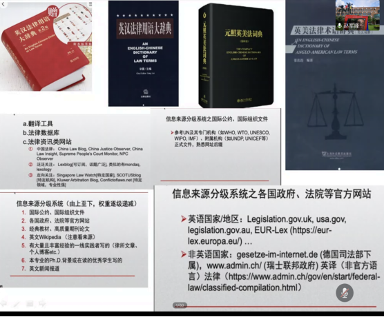 在談到法律翻譯的目的時,趙軍峰教授認為,法律翻譯的目的就是法律對等。在進行法律文本的翻譯過程中,譯者應該扮演好法律文本制作者的角色,首先必須充分理解而不是解釋原語文本的內容。他不能僭越自己的權限,只能在法律的含義之內解釋文本。此外,趙軍峰教授還就不同法系的平行文本對“勞動”相關詞匯的處理進行了案例分析,讓聽眾老師學子們對法律文本的翻譯有了更加深刻的印象,他同時為大家推薦了一些法律方面的書籍、工具、網站、數據庫及高效搜索資料的方法。