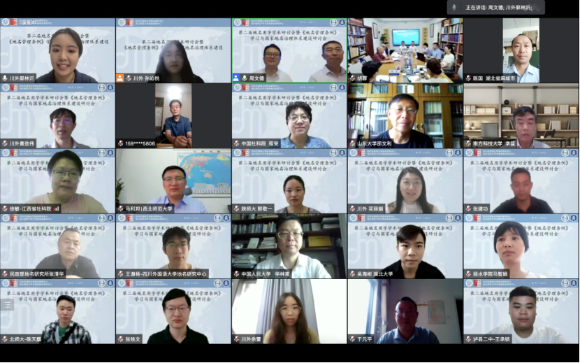 會(huì)議共有10場(chǎng)主旨發(fā)言和4場(chǎng)小組討論。主旨發(fā)言的專家和論文有:程榮(中國(guó)社會(huì)科學(xué)院)《地名用字在語文辭書中的擇收呈現(xiàn)》,王寅(四川外國(guó)語大學(xué))《地名的“內(nèi)涵義”與“外延義”—— 基于體認(rèn)地名學(xué)的探索》,李藍(lán)(南方科技大學(xué))《也談地名審定工作中的“名從主人”原則》,華林甫(中國(guó)人民大學(xué))《新時(shí)代加強(qiáng)歷史地名文化保護(hù)的實(shí)踐路徑》,周文德(四川外國(guó)語大學(xué))《地名用字的研究?jī)r(jià)值與意義》,商偉凡(中國(guó)地名學(xué)會(huì))《我國(guó)地名領(lǐng)域規(guī)范語言文字的五項(xiàng)任務(wù)》,張清華(民政部地名研究所)《地名研究工作的轉(zhuǎn)向和發(fā)展》,王濤(江西省社會(huì)科學(xué)院)《新時(shí)代 新法規(guī) 新特點(diǎn)——評(píng)新修<地名管理?xiàng)l例>》,張鐵文(中國(guó)社會(huì)科學(xué)院)《規(guī)范地名用字 賡續(xù)中華文化》,陳雙新(河北大學(xué))《京津冀地區(qū)“某各莊”之“各”來源與分布芻議》。在小組報(bào)告中,專家學(xué)者們圍繞地名用字的研究、新修訂的《地名管理?xiàng)l例》的學(xué)習(xí)、歷史地名文化保護(hù)、國(guó)家地名治理體系建設(shè)等方面展開了熱烈討論。四川外國(guó)語大學(xué)中國(guó)語言文化學(xué)院作為承辦單位,有王寅、周文德兩位教授作了主旨發(fā)言,李正權(quán)、王天翼、李麗萍、黃勁偉、魏智慧、王謝楊等老師和高鳳歌、朱虹平、唐立鵬、李麗等同學(xué)作了小組報(bào)告。