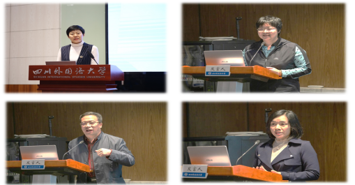 閉幕式由雙語詞典專業委員會副主任委員、商務印書館英語編輯室主任馬浩嵐主持。首先,6位平行論壇負責人對各組交流情況進行了小結。接著,雙語詞典專業委員會主任章宜華教授對本次大會進行了總結。他認為,本次大會非常成功,體現為“六少六多”的特色:(1)老面孔少了,新面孔多了,象征著老一代向新一代的學術傳承已經完成,詞典學研究后繼有人;(2)就詞典研究詞典的少了,跨學科的研究多了;(3)僅研究傳統詞典的少了,涉及數字化詞典的多了;(4)出版社緊盯著編輯出版的少了,關注詞典新理論新方法的多了;(5)僅談引進版詞典的少了,談原創詞典的多了;(6)僅埋頭編詞典出詞典的少了,關注詞典用戶使用的研究多了。章教授指出,將來詞典的發展趨勢是靜態使用會變少,詞典多模態化、融媒體化會增多,知識呈現動態化、查閱互動化增多。在即將到來的融媒體時代,詞典學研究者肩負應有的學術使命、承擔的時代責任,加強融媒體詞典、二語習得與對外漢語學習詞典的研究。章宜華教授宣布青年學者優秀論文獲獎名單,接著舉行頒獎典禮。雙語詞典專業委員會秘書、四川外國語大學胡文飛教授宣讀會議紀要,并提請全體代表審議表決。下屆會議承辦單位代表發言。黑龍江大學張春新教授就承辦第十四屆全國雙語詞典學術研討會進行了表態發言,華僑大學陳文革教授就承辦第七屆詞典學與二語教學國際研討會進行了表態發言。最后,雙語詞典專業委員會常務理事、承辦方負責人王仁強教授致閉幕詞,對各位專家為川外師生提供極為難得的學習機會表示感謝。至此,本屆大會圓滿落幕。