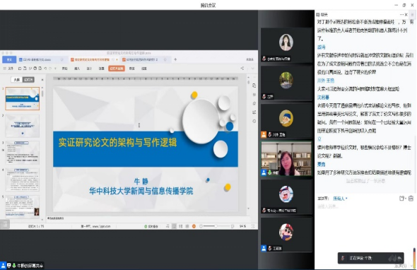 11月15日晚,華中科技大學新聞與信息傳播學院教博士生導師牛靜教授應邀為新聞傳播學院師生做了一場主題為《實證研究論文的架構與寫作邏輯》的線上學術講座。講座由新聞傳播學院院長劉國強教授、新聞學系王艷副教授主持,我校及部分外校師生共270余人參加。劉國強院長代表學院非常感謝遠在美國的牛靜教授帶來跨洋學術交流,為師生打開論文寫作的大門。