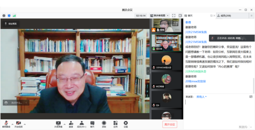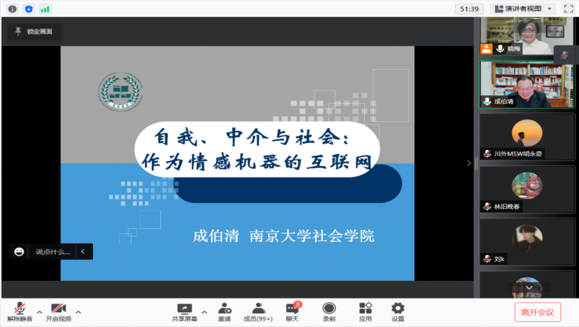 11月17日晚上6點30分,由四川外國語大學(xué)國際法學(xué)與社會學(xué)院舉辦的“社會學(xué)專業(yè)辦學(xué)十周年(2011-2021)學(xué)術(shù)名家講座”第十四講通過線上騰訊會議成功舉行。南京大學(xué)社會學(xué)院院長、博士生導(dǎo)師成伯清教授應(yīng)邀作題為《自我、中介與社會:作為情感機(jī)器的互聯(lián)網(wǎng)》的學(xué)術(shù)報告,共計230余名師生聆聽了本次報告。