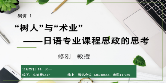 演講1的題目為“‘樹人’與‘術業(yè)’—日語專業(yè)課程思政的思考”。修剛從日語專業(yè)“術業(yè)“與“樹人”的特征、日語專業(yè)“樹人”與“術業(yè)”關聯(lián)、樹人、術業(yè)與任課教師等方面進行了講述。