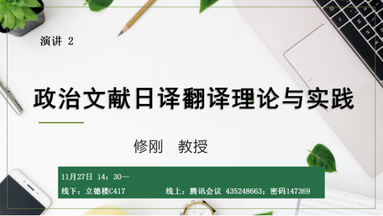 11月27日下午13點半,應我校日語系主任黃芳老師的邀請,教育部高等院校外語專業(yè)教指委日語分委會主任委員、中華日本學會副會長修剛教授為我校教師和研究生舉行了特別演講,講座采用線上線下相結合的方式進行。到場人員有黃芳老師、陳可冉老師和吳揚老師以及MTI專業(yè)的研究生,多位老師在線上觀看了這次講座。