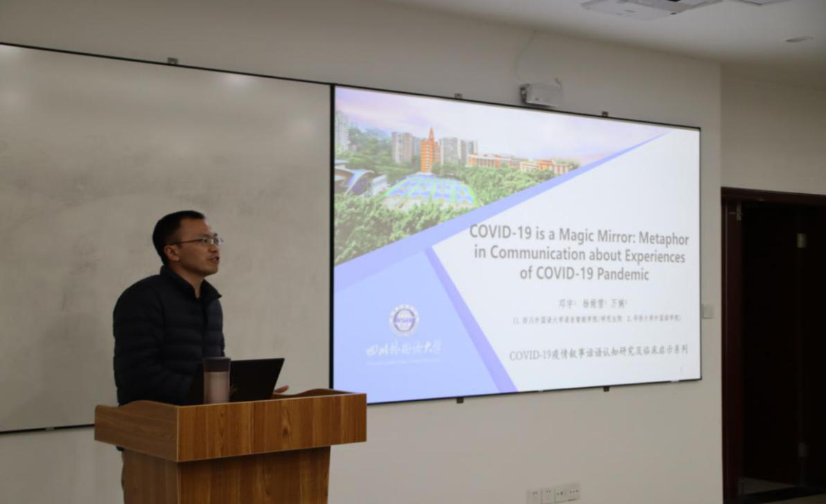 第二場鄧宇博士作題為“COVID-19疫情敘事話語認知研究及臨床啟示” 的報告。鄧老師首先介紹了隱喻在揭示人類思維奧秘及拓展具身認知體驗的理論意義;其次提到由于目前學界暫無針對新型冠狀病毒肺炎的話語隱喻的研究,本研究將對27位在武漢親歷我國新冠肺炎爆發時期的醫患人員和志愿者的訪談內容,作為話語分析的基礎,系統地將受訪者話語中所包含的隱喻進行了詳細的分類,旨在通過隱喻來剖析受訪者在經歷新冠肺炎下的心理狀態;最后,指出隱喻在新冠肺炎親歷者的話語中出現的頻率高達14%,反映了在傳播能力強、致死率高的新冠肺炎背景下,親歷者會比平時使用更多的隱喻來表達對疾病、死亡、抗爭等相關概念的認知。