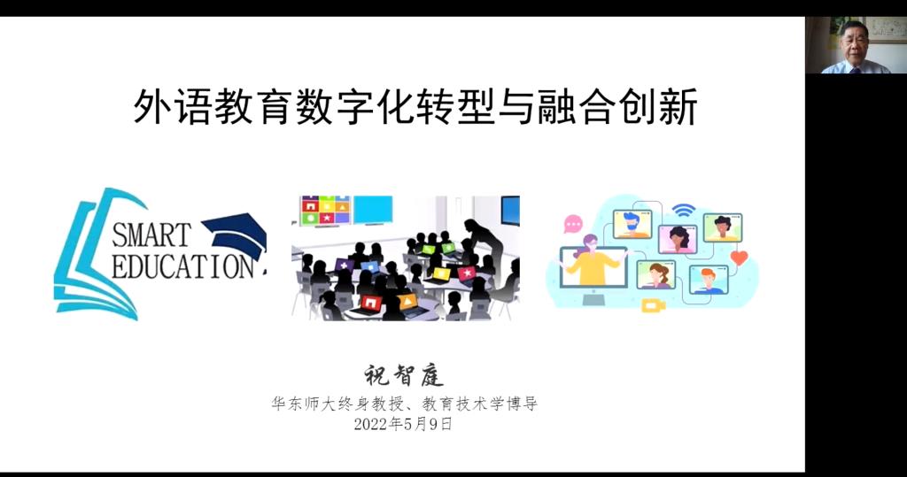 2022年5月9日下午,應四川外國語大學邀請,華東師范大學終身教授、教育技術學博士生導師祝智庭教授通過線上會議,開展了題為“外語教育數字化轉型與融合創(chuàng)新”的專題講座。本次講座是四川外國語大學嘉陵講壇新文科教改系列的第六次講座,由四川外國語大學副校長祝朝偉教授主持,校內外約1000名學者積極參與。