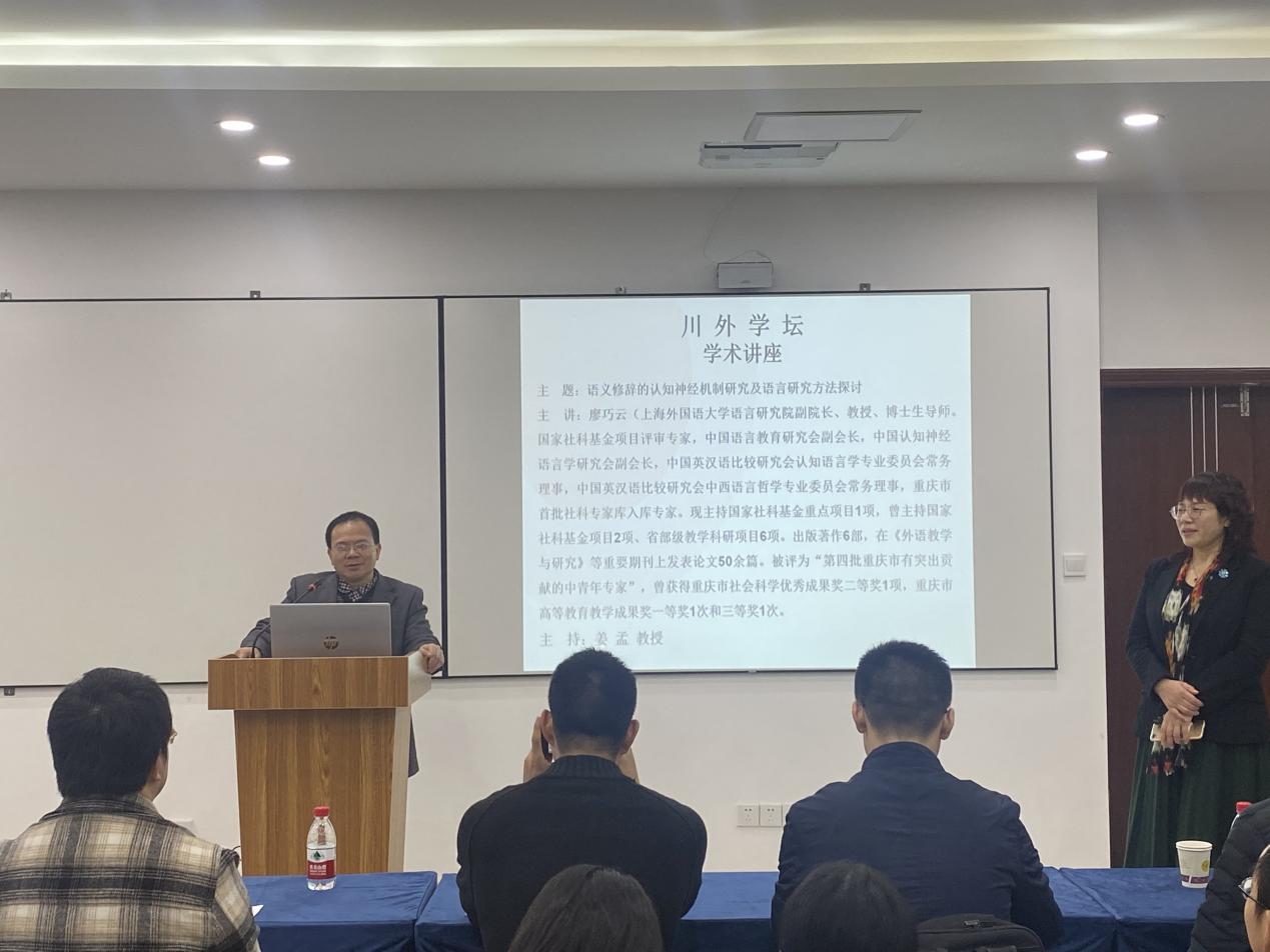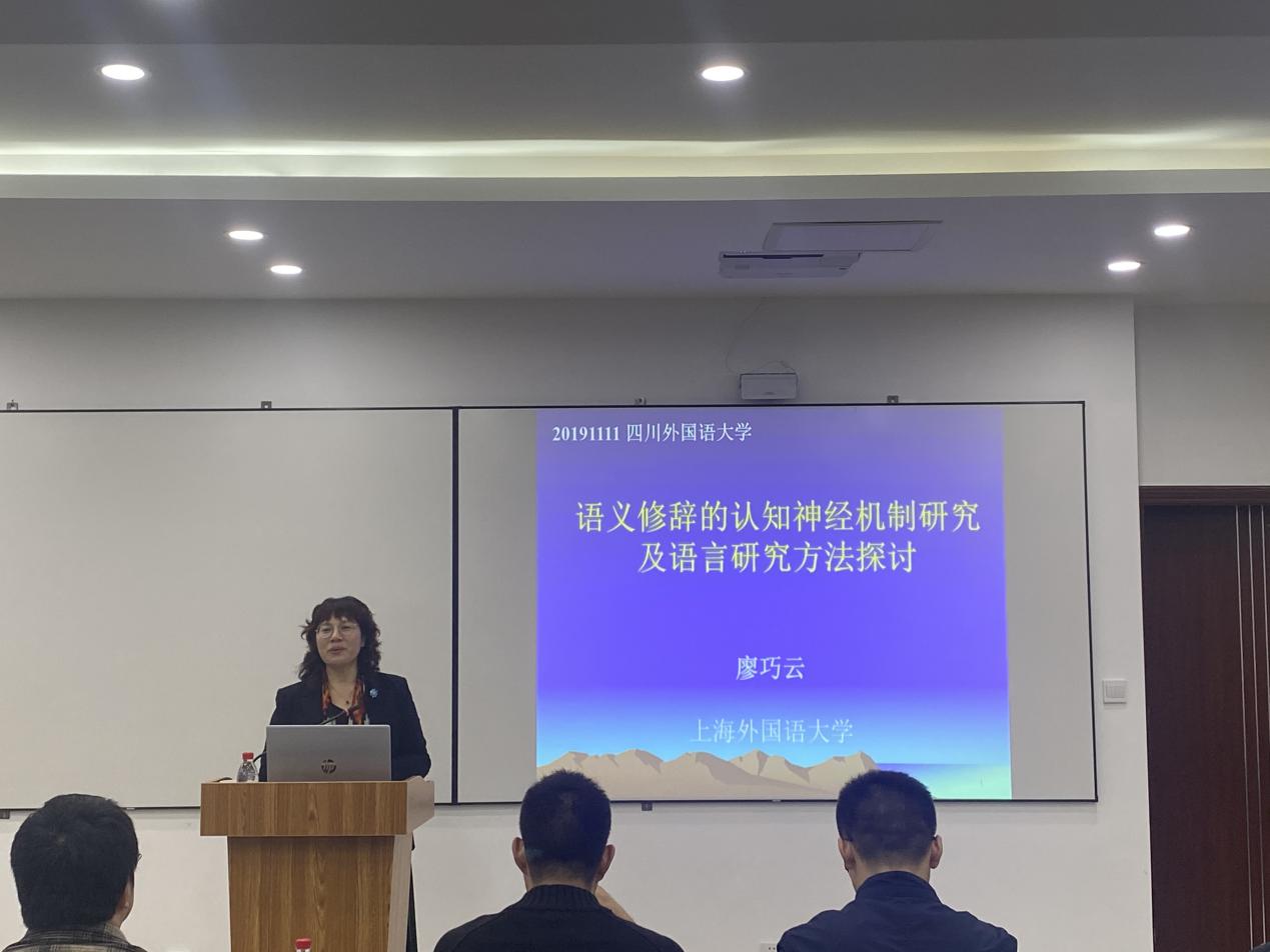 2019年11月11日晚上7:00,應語言智能學院、語言腦科學研究中心及川外學壇的邀請,上海外國語大學語言研究院副院長、博士生導師廖巧云教授在博文樓舉行題為“語義修辭的認知神經機制研究及語言研究方法探討”的學術講座。本次活動由語言智能學院執行院長、語言腦科學研究中心主任、博士生導師姜孟教授主持,我校眾多教師以及碩博士研究生參加了此次活動。