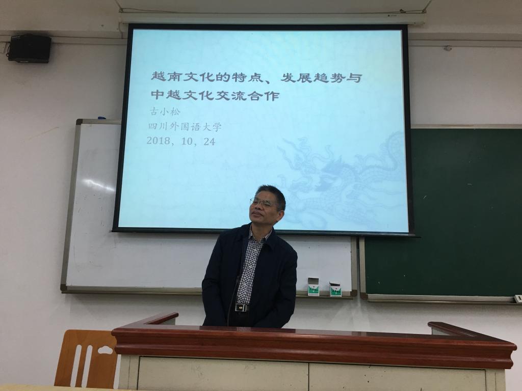 10月19日,廣西社會科學(xué)研究員古小松博士應(yīng)邀來到我校開展專題講座,古小松博士長期致力于東南亞歷史文化和越南問題的研究,目前擔(dān)任全國東南亞研究會副會長,廣西東南亞研究會會長,是全國宣傳文化系統(tǒng)四個一批人才。古小松博士是廣西具有突出貢獻(xiàn)的科研人員,在東南亞文化研究領(lǐng)域造詣頗深,成果豐富。講座分為兩場,由我校越南語專業(yè)教師黃憲華主持。