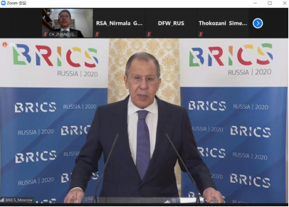 俄羅斯外長(zhǎng)謝爾蓋·拉夫羅夫?yàn)檎搲_(kāi)幕式致辭。他表示當(dāng)前新冠疫情在全球的大流行凸顯了當(dāng)前全球化進(jìn)程中大多數(shù)挑戰(zhàn)已超越國(guó)界,只有普遍尊重國(guó)際法和聯(lián)合國(guó)的作用才能共同應(yīng)對(duì)這些挑戰(zhàn)。在聯(lián)合國(guó)成立75周年之際,金磚五國(guó)更應(yīng)團(tuán)結(jié)一致,支持以聯(lián)合國(guó)為中心的架構(gòu),支持在《聯(lián)合國(guó)憲章》原則和世界文化與文明多樣性的基礎(chǔ)上建立一個(gè)更公平、更民主的多極世界秩序。
