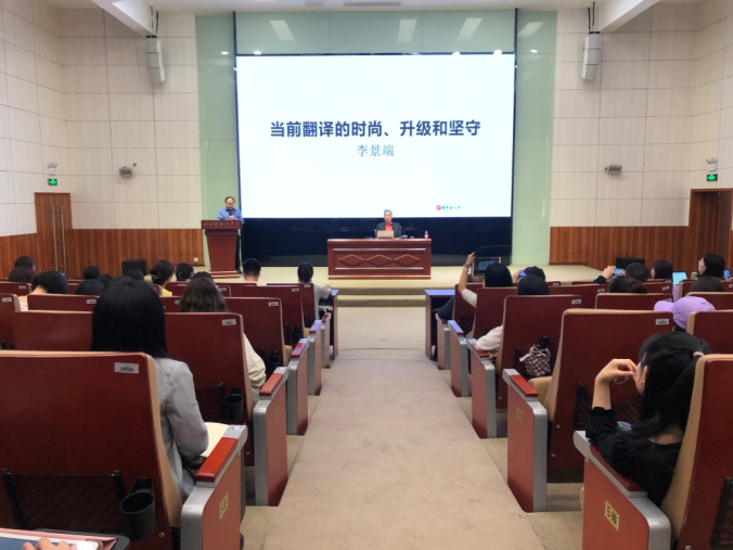 2021年4月26日下午4:30,譯林出版社首任社長兼總編輯李景端先生應邀于宏文樓國際報告廳開展了題為“翻譯的時尚、升級和堅守”的學術講座。此次講座由科研處處長嚴功軍教授主持,我校百余名師生參加了本次講座。