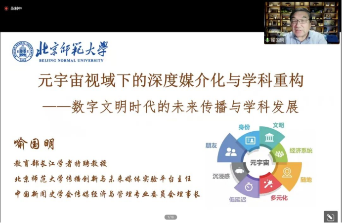 11月22日晚,北京師范大學新聞傳播學院學術委員會主任、博士生導師喻國明教授應邀為新聞傳播學院師生做題為《元宇宙視域下的深度媒介化與傳播學的學科重構》的線上學術講座。這是川外“名師講堂”第10講,也是新聞傳播學院“歌樂傳播大講壇”第45期。院長劉國強教授主持講座,我校及部分外校師生300人參加。