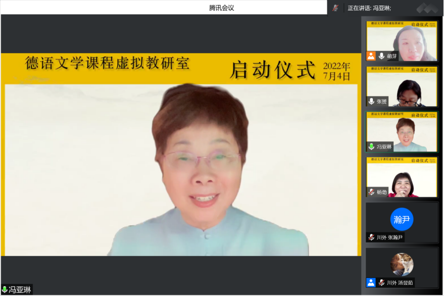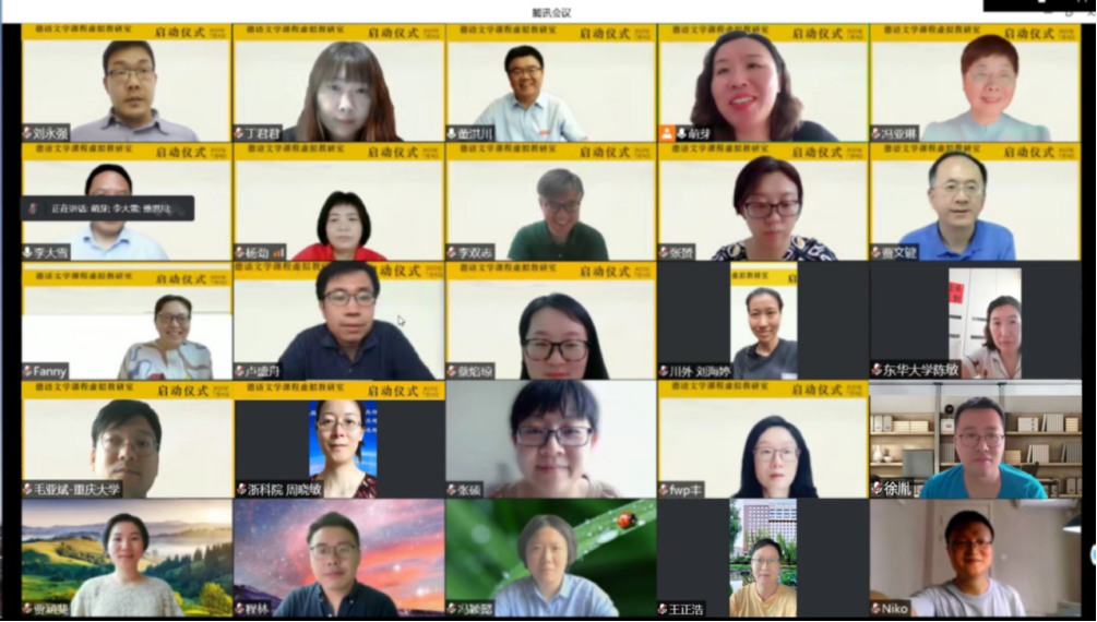 2022年7月4日,獲批教育部第二批試點(diǎn)建設(shè)單位的德語(yǔ)文學(xué)課程虛擬教研室在騰訊會(huì)議平臺(tái)上舉行了啟動(dòng)儀式。儀式分為兩個(gè)部分:第一部分為致辭環(huán)節(jié),第二部分是學(xué)術(shù)報(bào)告,來(lái)自四川外國(guó)語(yǔ)大學(xué)、北京外國(guó)語(yǔ)大學(xué)、中山大學(xué)、復(fù)旦大學(xué)、南京大學(xué)、浙江大學(xué)、同濟(jì)大學(xué)、中國(guó)人民大學(xué)、廣東外語(yǔ)外貿(mào)大學(xué)等二十多所國(guó)內(nèi)外高校的百余位師生在線參與了此次啟動(dòng)儀式。