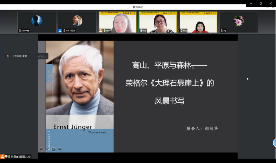 德語(yǔ)文學(xué)課程虛擬教研室常務(wù)副主任、四川外國(guó)語(yǔ)大學(xué)德語(yǔ)學(xué)院鄭萌芽副教授題為《高山、平原與森林——榮格爾<大理石懸崖上>的風(fēng)景書寫》的報(bào)告從文本的空間編排、幾何圖形、語(yǔ)言景觀三個(gè)方面出發(fā),指出文本展演的空間結(jié)構(gòu)呈現(xiàn)自上而下的立體維度,使用法文單詞、古詞和新詞行文的文體風(fēng)格也是敘事自我賦予語(yǔ)言秩序的過(guò)程。風(fēng)景作為時(shí)代形態(tài)的投影,完成了文本內(nèi)外雙重意義上的敘事,作家榮格爾由此建構(gòu)了有序失序共生辯證的景觀世界。