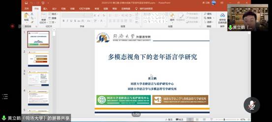 下午16時,同濟大學黃立鶴副教授做了第二場題為“多模態視角下的老年語言學研究”。他從三個方面展開講解,第一個方面是老年語言學的構建背景與研究現狀,第二方面是老年語言現象的多模態研究,最后一個方面是多模態研究的啟示和一些感悟。他指出在“十四五”期間,中國老年人口突破3億,進入中度老齡化社會。在此現狀下,老年語言學研究具有基礎理論、臨床應用、社會關懷等多重研究意義。他分析了國外相關研究的歷時發展,理清了該研究方向的歷史,用著名的修女研究舉例說明了老年語言學研究的特點。他指出,多模態研究主要體現在視角的多維性,數據的集成性和方法的交叉性。他還詳細介紹了老年語言學最新的研究方法與理論,如:受控實驗法、個案跟蹤研究、民族志法等。最后,他提出了要建立中國特色老年語言學的目標與展望。