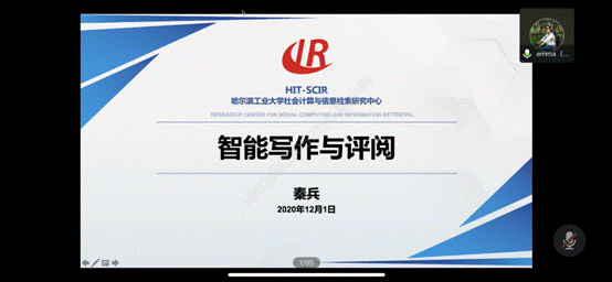 緊接著,秦兵教授作了第二場題為“智能寫作和智能閱卷”的講座。首先,秦兵教授從人工智能發展的三個階段著手,依次介紹了智能寫作的研究現狀、智能寫作技術在各種文本中的運用、智能評閱技術以及對該技術的總結與展望。秦兵教授談到,人工智能發展經歷了計算智能、感知智能及認知智能三個階段,目前可以將人工智能運用到數據到文本的寫作、詩歌寫作、辦公文書輔助寫作等諸多領域之中。接下來,秦兵教授介紹了智能評閱在諸多考試中的運用,尤其是用于語文作文自動評分方面。最后,秦兵教授總結道,目前基于神經網絡的智能寫作取得了較好的效果,但也需要進一步的優化。對此,秦兵教授提出了自己對該方面的研究展望,希望智能寫作能夠呈現出更加圖文并茂的多模態形式。