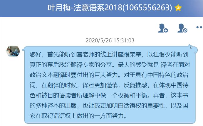 宮教授的講座也讓學生們受益匪淺,2018級法意語系的學生葉月梅說,“首先很榮幸能聽到宮老師的線上講座,以往很少能聽到真正的幕后政治翻譯專家的分享。最大的感受就是譯者在面對政治文本翻譯時所付出的巨大努力。在翻譯具有中國特色的政治詞時,譯者更加謹慎,反復推敲,在體現中國特色和被目的語讀者所理解中做一個權衡和平衡。再者,這本書的多種譯本的出版,也讓我更加體會到話語權的重要性,以及國家層面所作出的努力。”