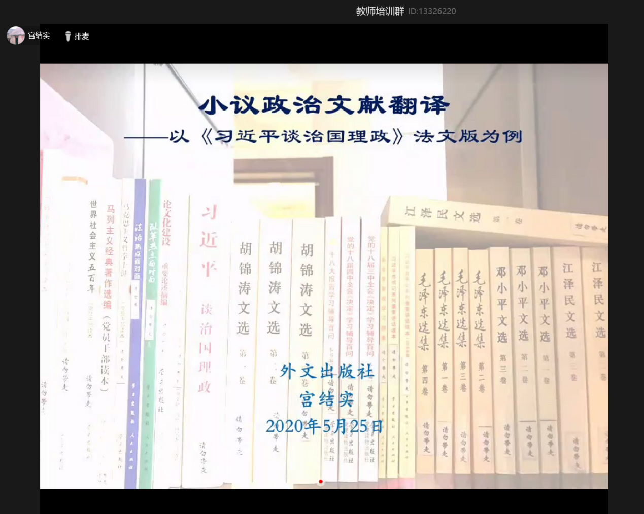 思政教育“進課堂”師資團隊系列培訓之“《習近平談治國理政》法譯解析”于5月25日順利開講。本次主講嘉賓為外文出版社首席法文專家宮結實教授。宮教授于2009年被評為“中國外文局建局70周年杰出貢獻獎”,編撰多部雙語工具書,審定多部法文圖書,如《習近平談治國理政》(第一卷、第二卷、第三卷)、習近平《擺脫貧困》、《之江新語》等。本次講座由法意語系楊少琳教授主持,來自法意語系、東方語學院、翻譯學院、國際關系學院、英語學院、商務英語學院、馬克思主義學院等院系教師及部分學生參加了講座。