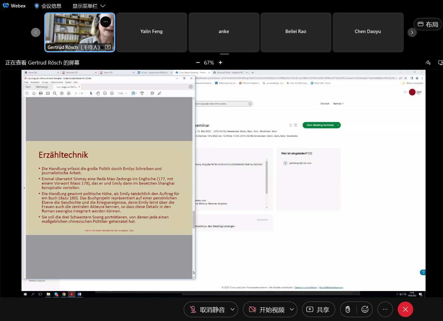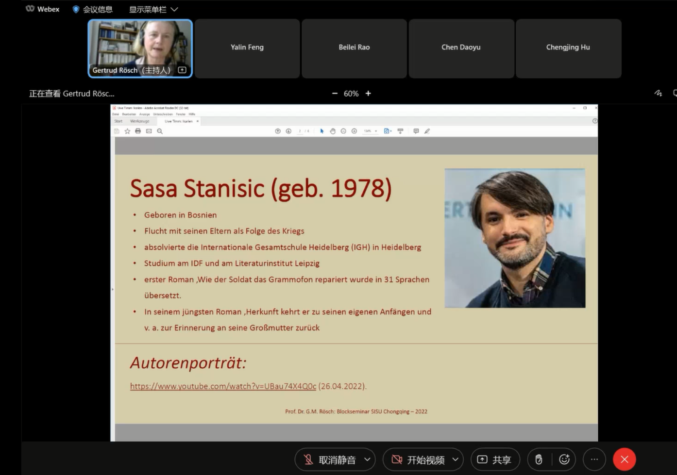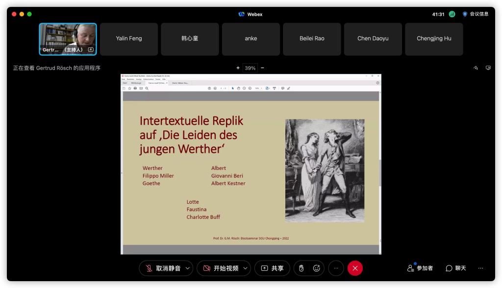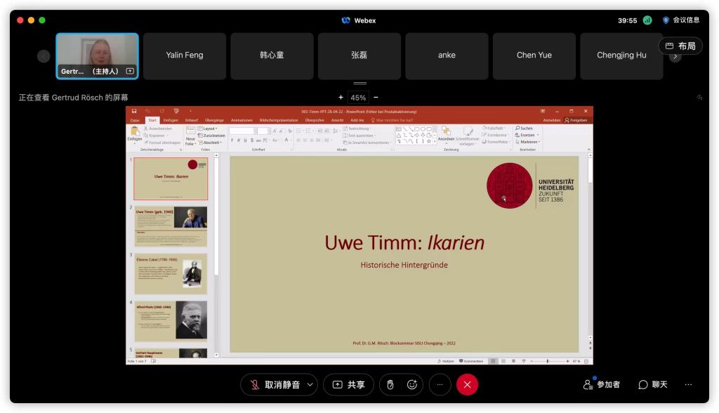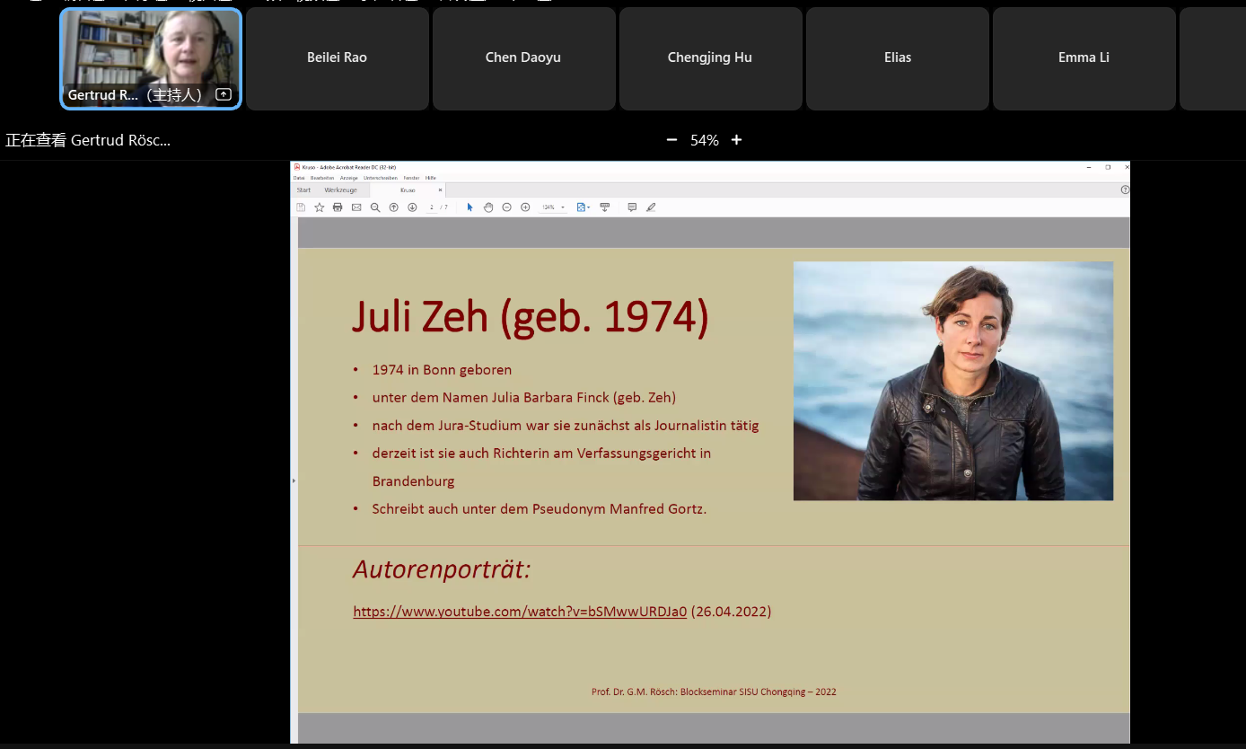 2022年4月21日至5月19日期間,四川外國語大學邀請德國海德堡大學戈圖特·羅施教授于每周四晚上7點為德語語言文學專業師生開展主題為“虛構性與真實性”的系列講座,由四川外國語大學馮亞琳教授擔任主持。來自四川外國語大學、復旦大學、哥廷根大學、慕尼黑大學等國內外院校的師生在線與會并參與討論。