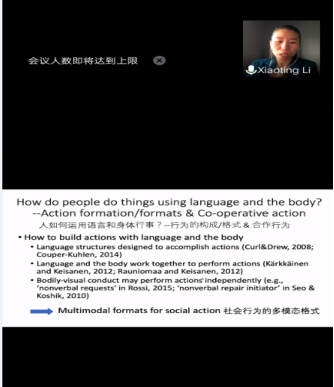 李曉婷老師從互動語言學與多模態互動的概念入手,引入了本次講座的主題——語言交互與多模態研究。通過分析行為的構成、格式及合作行為的定義,講座強調了從說話者身體——視覺行為、句法結構/投射、語音/韻律、知識具備、序列位置、社會互動特征等層面對不完整評價進行剖析的重要性,解釋了交互參與者在交互過程中,在句法、韻律、動作行為等方面相互約束的現象,體現了多模態研究的多維視角與特點。