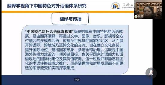 2020年12月12日下午,教育部青年長(zhǎng)江學(xué)者、同濟(jì)大學(xué)外國(guó)語(yǔ)學(xué)院院長(zhǎng),博士生導(dǎo)師吳赟教授應(yīng)邀為我校師生進(jìn)行了一場(chǎng)題為“中國(guó)特色話語(yǔ)體系構(gòu)建:歷史鏡鑒與發(fā)展思考”的線上講座。本次講座是四川外國(guó)語(yǔ)大學(xué)“對(duì)外話語(yǔ)體系譯介與傳播”系列講座之一,由翻譯學(xué)院李希希博士主持。