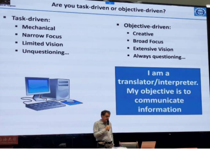 講座伊始,弗格森先生通過“六度分隔原則”對自己進行了一個簡要的自我介紹,并向大家分享了兩段習近平總書記的講話英譯版,引出了“Task-driven”和“Objective-driven”這兩個概念。