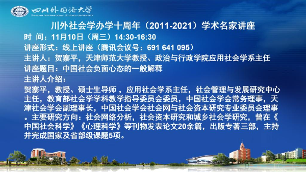 主題川外社會學辦學十周年學術名家講座:中國社會負面心態的一般解釋
