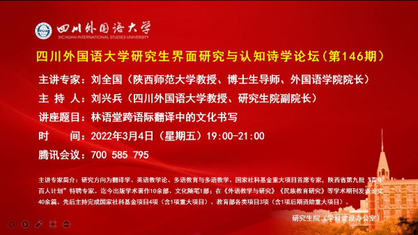 主題四川外國語大學研究生界面研究與認知詩學論壇(第146期)林語堂跨語際翻譯中的文化書寫
